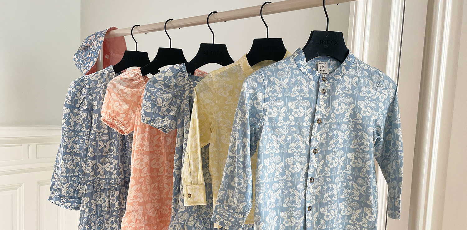 I denne kolleksjonen har Lindex designet klassiske sommerplagg til barn, baby og dame med mini me-antrekk. Kjoler med volang-detaljer, en myk sommerskjorte og tilbehør. Alt er i det nydelige blomstertrykket «De mina» av Carl Larsson. Plaggene kommer i dus blå, gul og korall, er laget av myk økologisk bomull og er GOTS-sertifiserte.